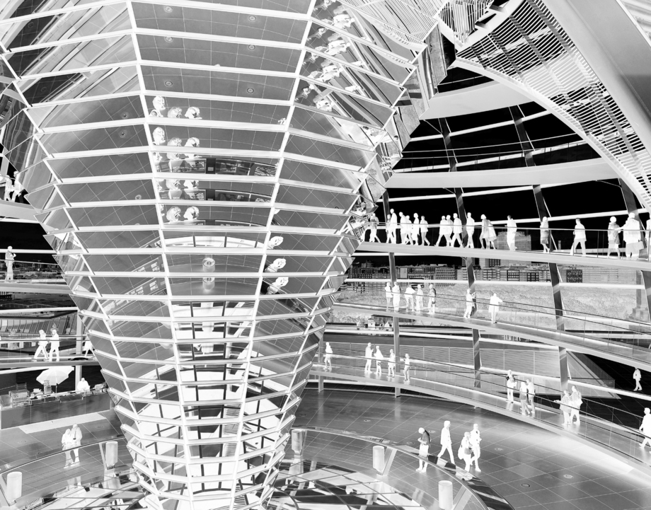 The pure photographs are a homage to the black-and-white era of photographic art, and they have often been transformed into the negative form previously created in the film development process.